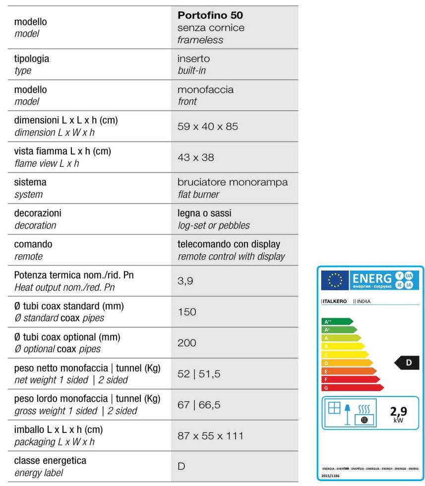 Portofino 50 front is a compact, flat-front fireplace, offering a clean and modern look, perfect for smaller or more intimate living spaces.