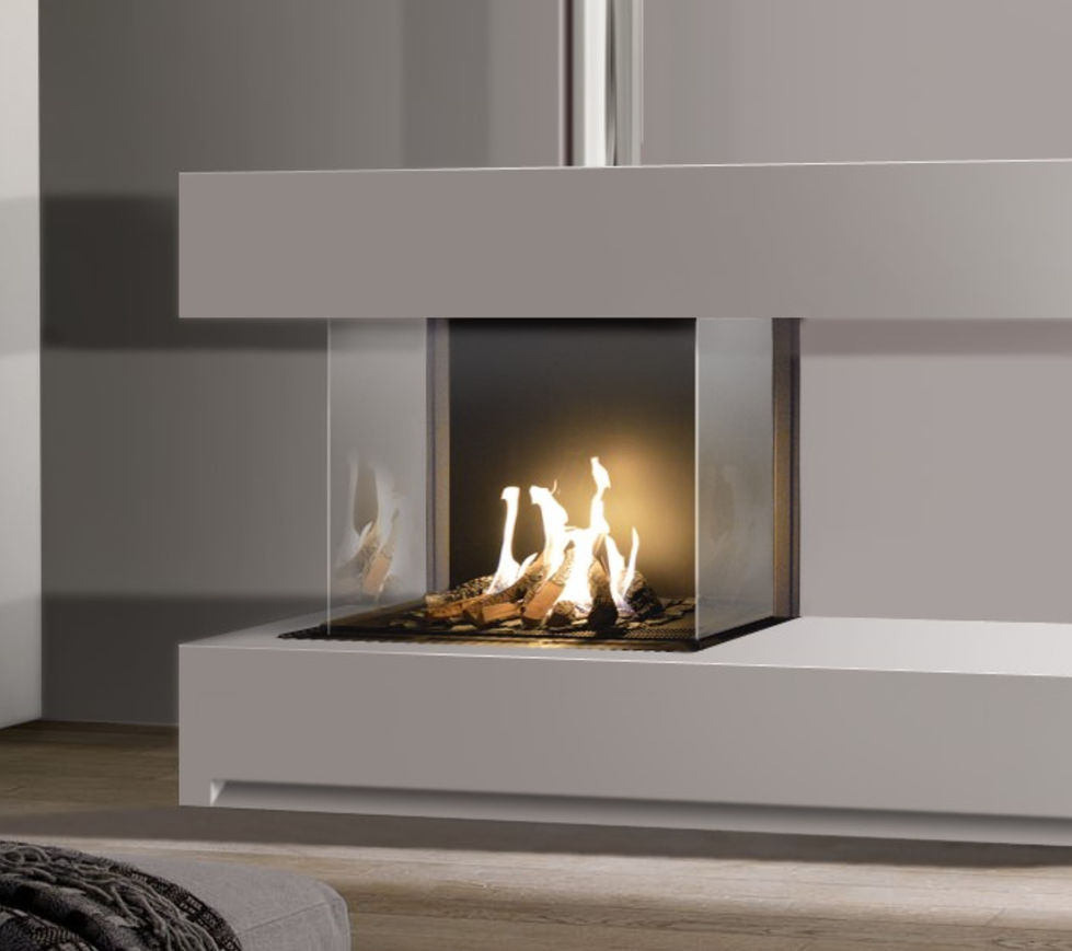 Siena 80F wall-mounted with three visible sides offers an open, panoramic view of the flames, creating a captivating centrepiece that complements modern interiors.